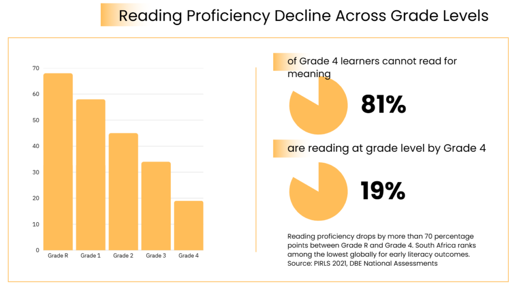 South Africa’s early literacy outcomes consistently rank among the lowest globally. The Progress in International Reading Literacy Study has repeatedly highlighted the severity of the issue. According to the most recent results, approximately 81 percent of Grade 4 learners in South Africa cannot read for meaning in any language.